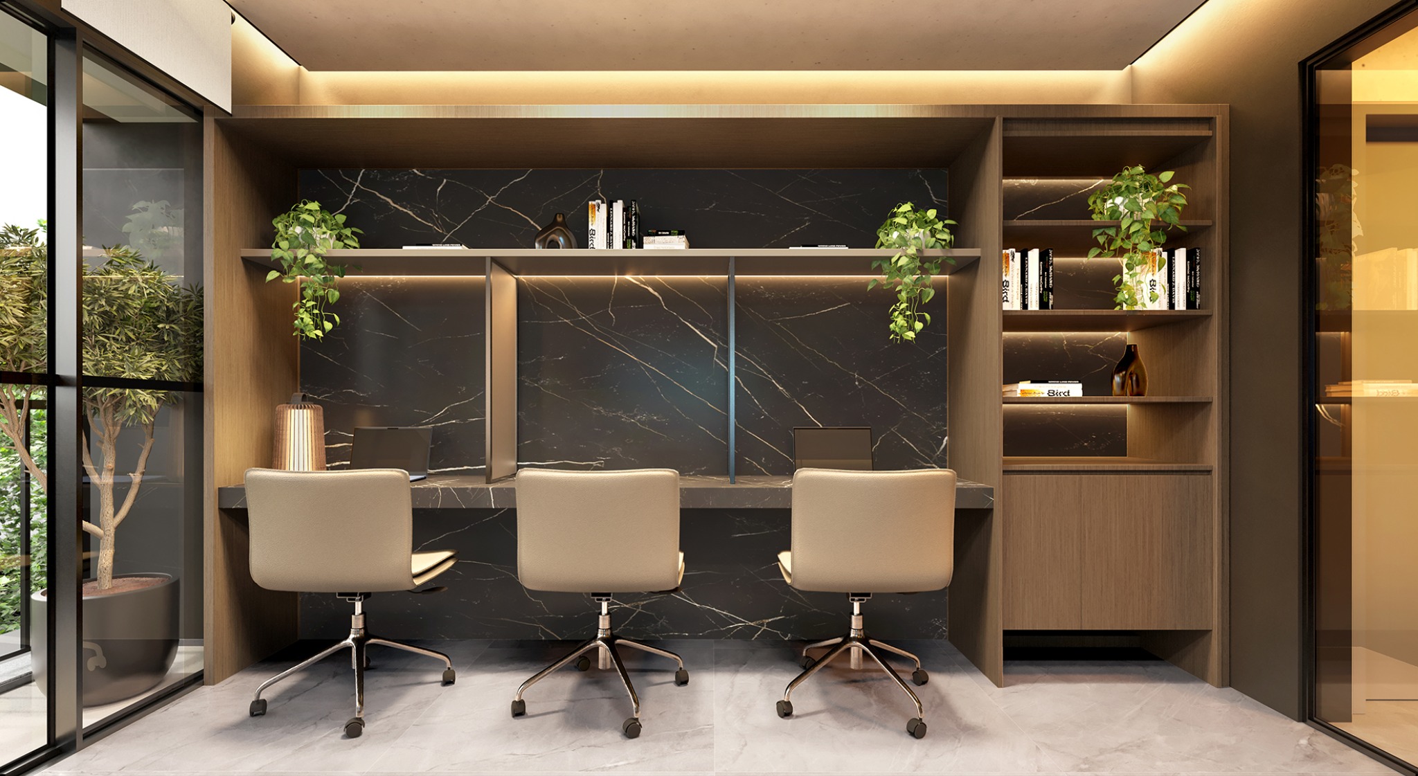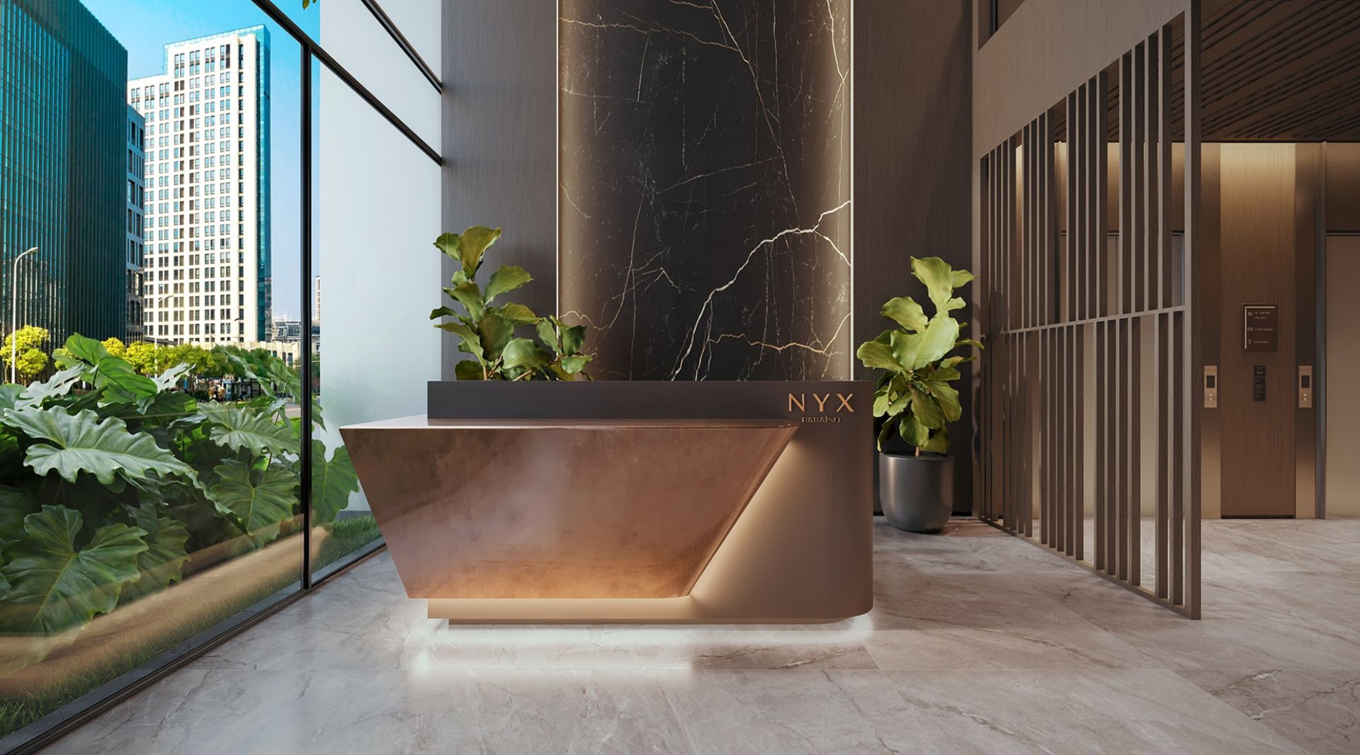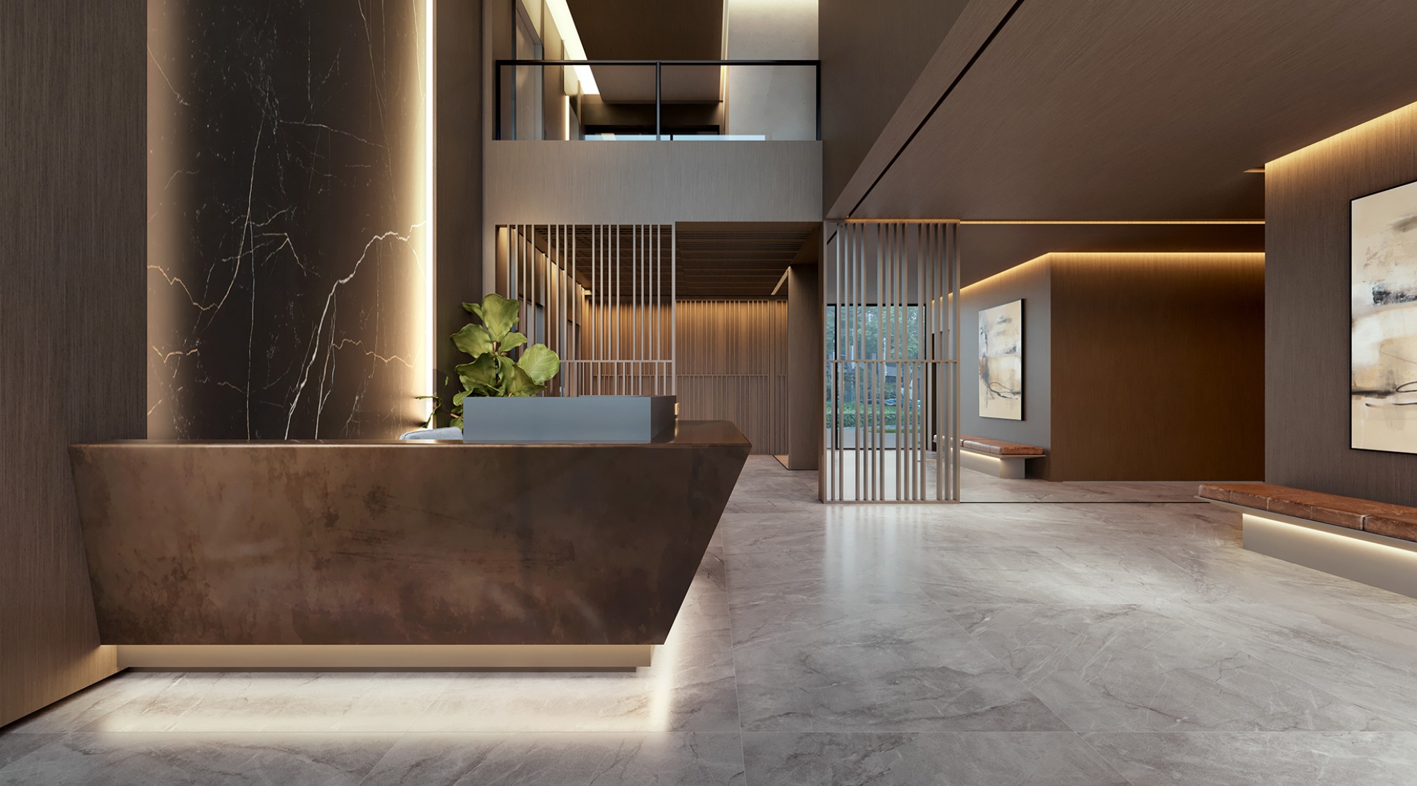 Recepção com balcão e pé-direito duplo